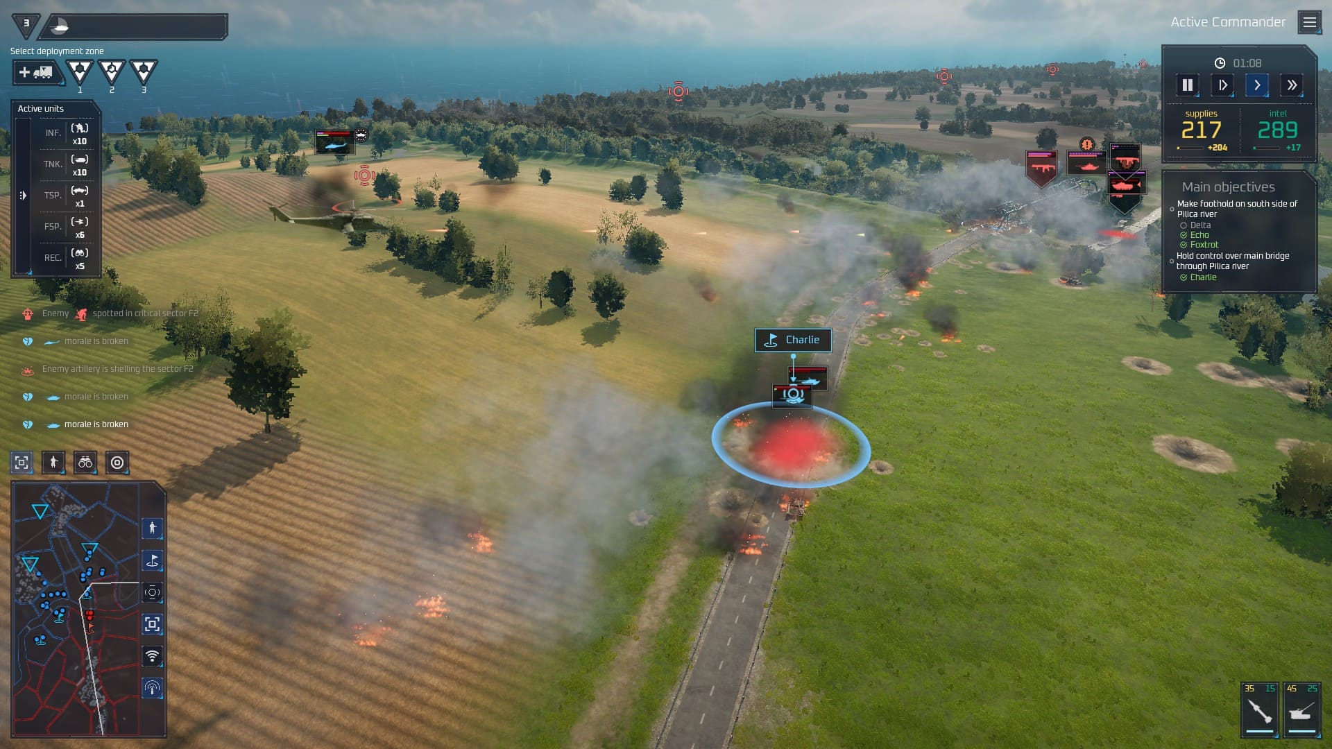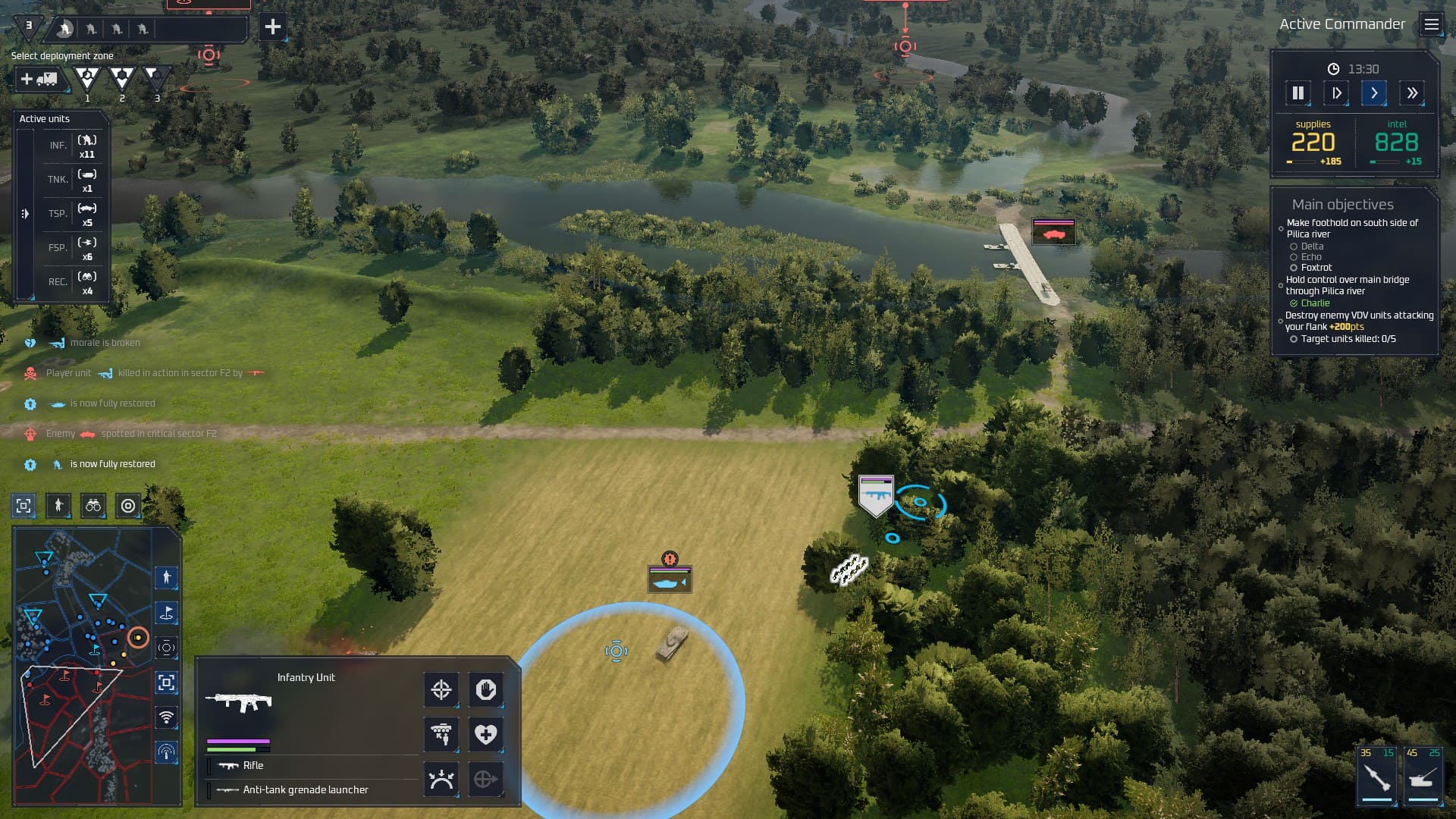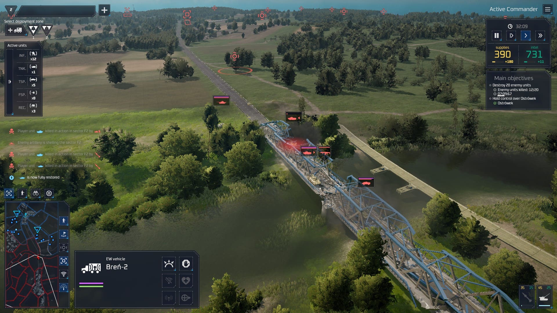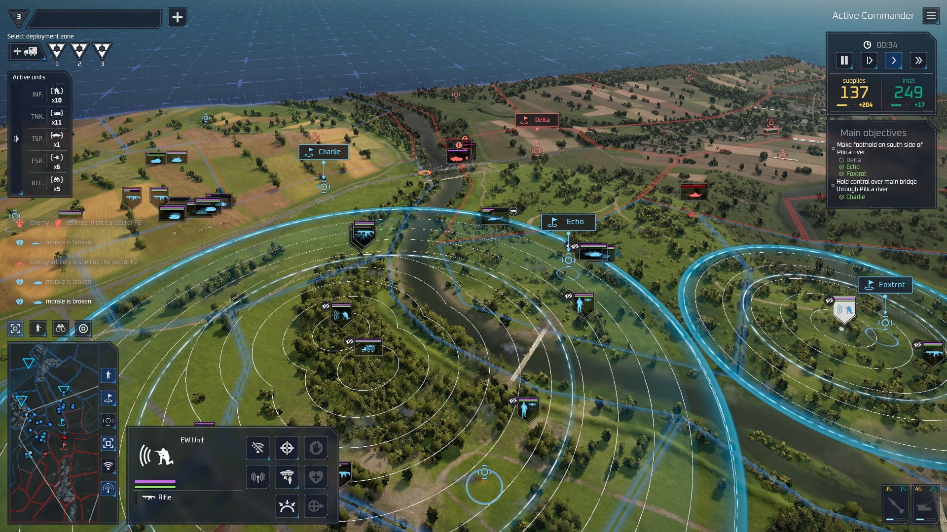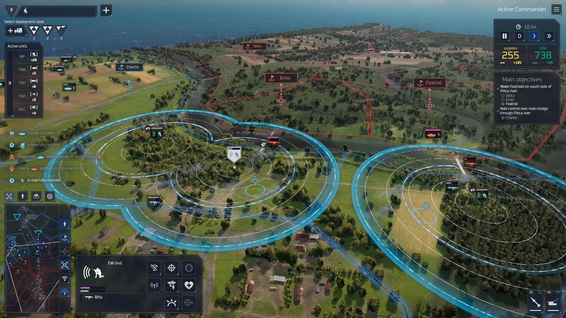 J’ai pu tester le volet tactique à travers un tutoriel et une longue escarmouche opposant la Pologne à la Russie près de la rivière Pilica. On se trouve ici face à un ersatz de Broken Arrow, arcade et dynamique à souhait, un peu léger jugé seul mais très correct au vu de ce que nous réserve le jeu complet. Dans les grandes lignes, Systemic War proposera 25 cartes reproduisant à l’identique des lieux réels sensibles, sur lesquelles vous engagerez les troupes conçues depuis le volet stratégique à partir d’un panel de 150 unités uniques et personnalisables. Et parmi elles, des unités bien spécifiques : les opérateurs de drone et les unités de guerre électronique.