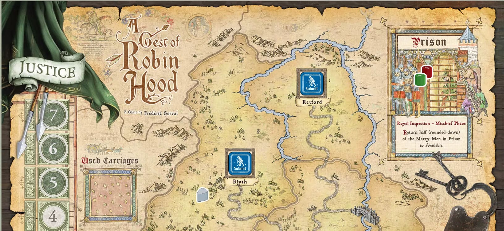 Dans A Gest of Robin Hood, qui se joue en duel, un joueur incarne Robin des Bois et sa bande, chargés de voler aux riches pour donner aux pauvres. Mais le Sheriff de Nottingham et ses sbires veillent… Plus simple, rapide et familial que Vijayanagara, Robin Hood saura ratisser un plus large public. Le tutoriel intégré permet de découvrir sans pression les rouages du titre.