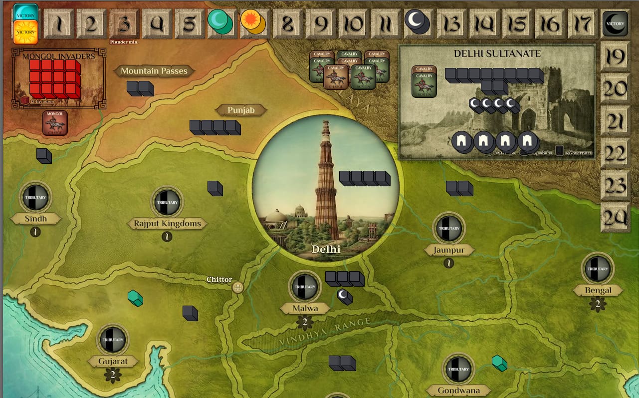 Vijayanagara dépeint le conflit entre les différents royaumes Indiens du XIVème siècle, pour 1 à 3 joueurs. Bien que plus accessible qu’un COIN, Vijayanagara reste un jeu sérieux à forte connotation historique et avec un thème particulier.