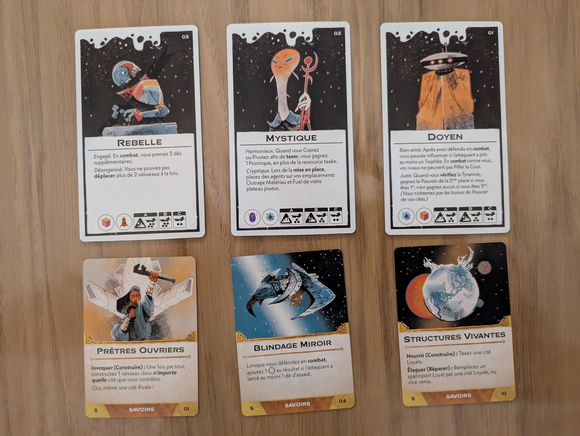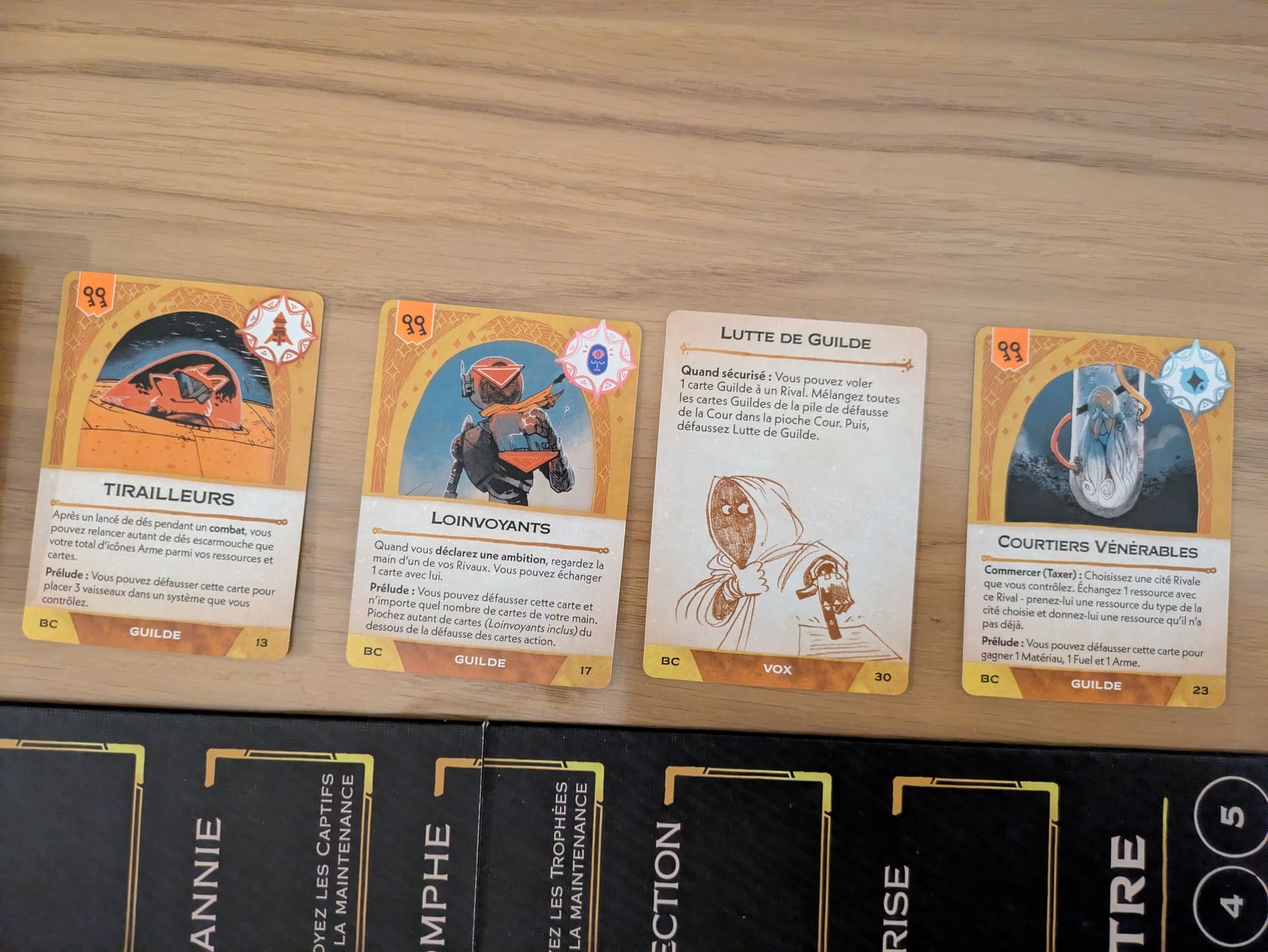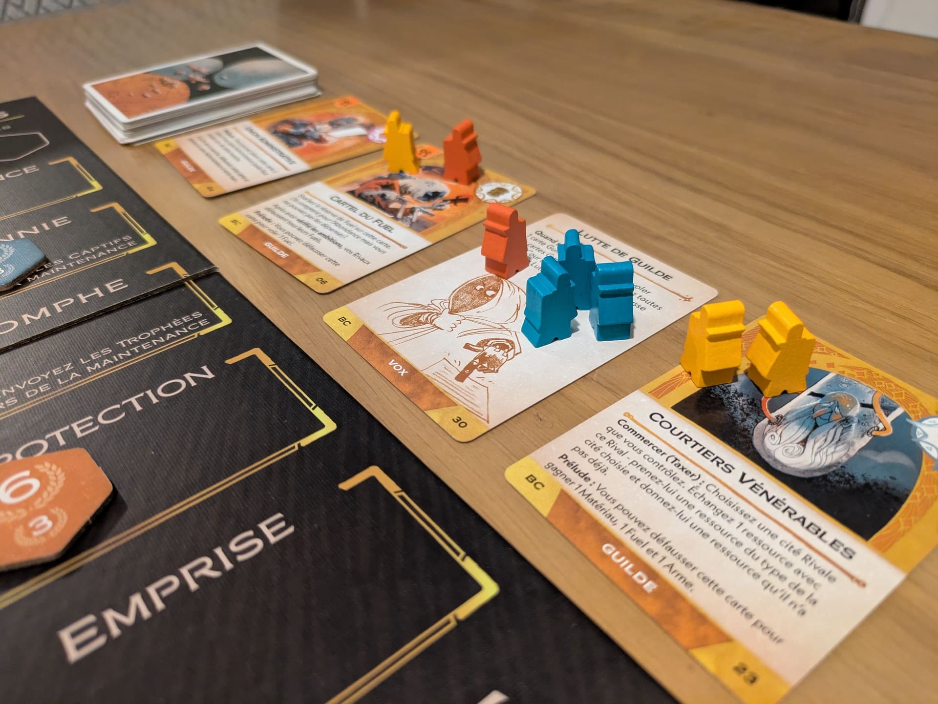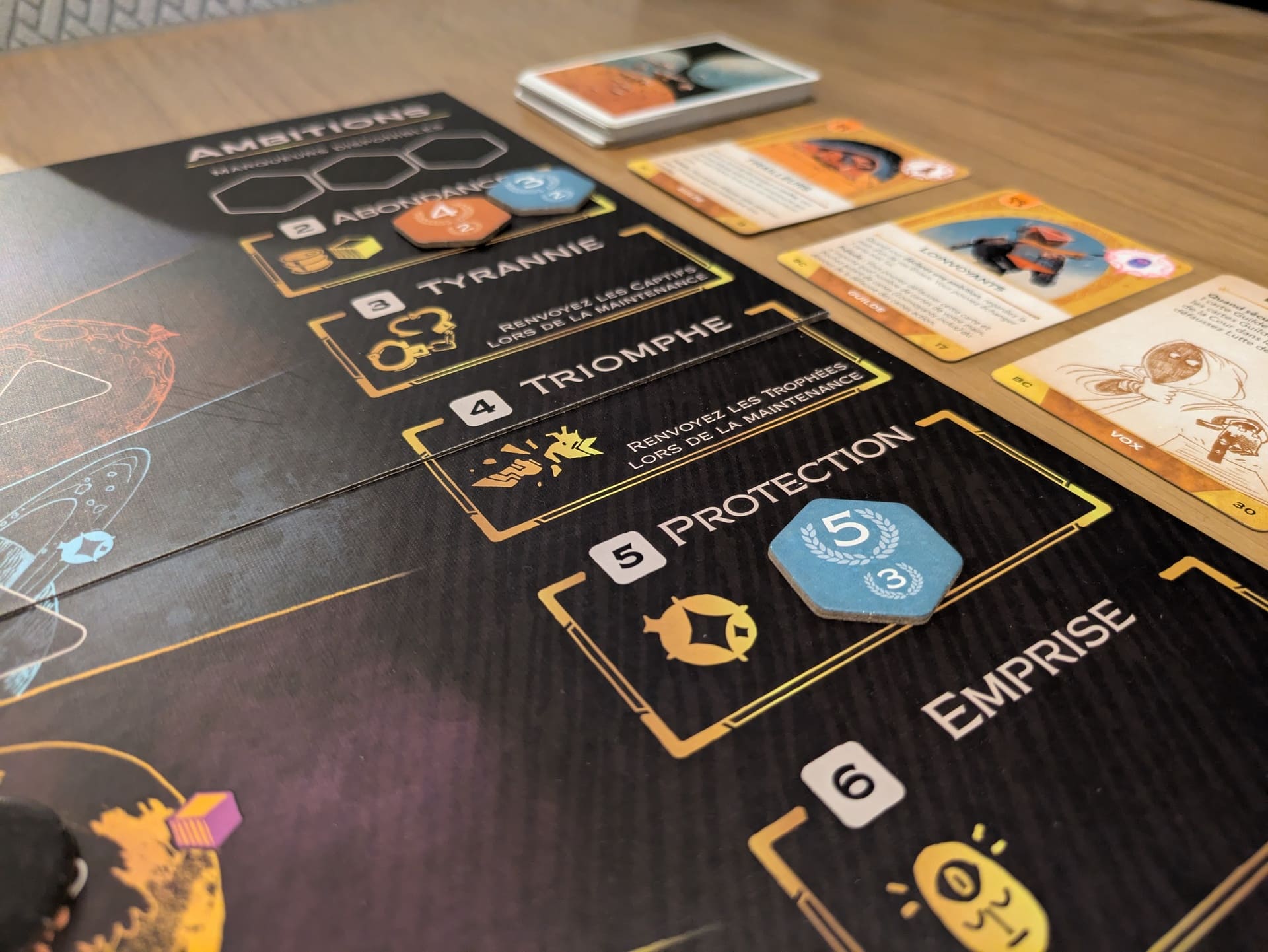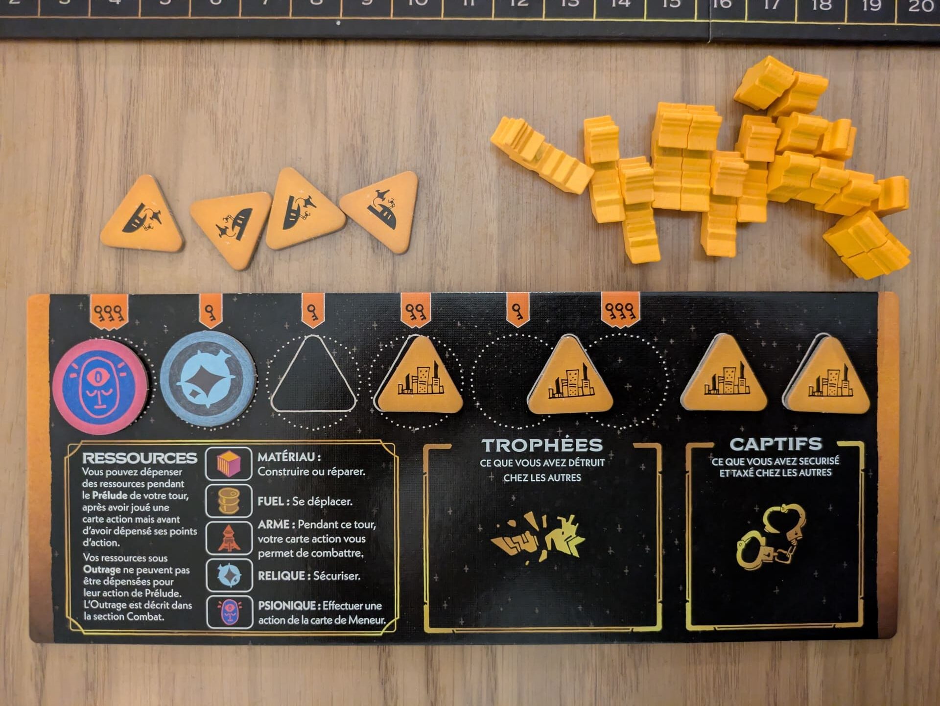 La crise frappe les confins, comme en atteste la faible quantité de ressources en jeu. Les joueurs se battent pour seulement 5 unités de chaque type, un nombre très restreint qui invite à les dépenser avec parcimonie. Vous pouvez en effet les dépenser avant de jouer votre carte afin de réaliser une action gratuite dépendant de la ressource consommée. Mais peut-être préférez-vous les conserver dans un coffre fort aux multiples blindages -votre plateau individuel, afin de viser des ambitions ou priver vos adversaires de ces dernières. Il ne faudra cependant pas vous étonner si une armada se pointe aux portes de votre cité.