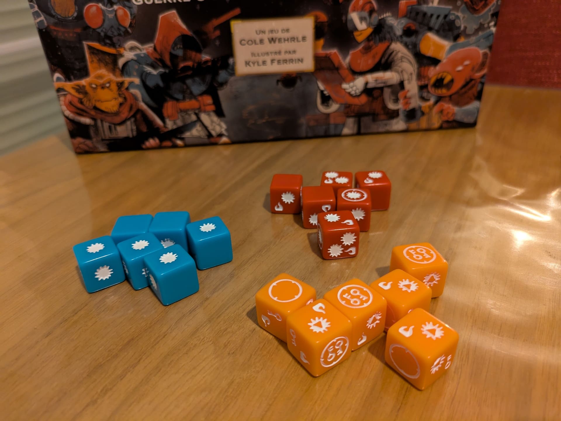 La guerre dans Arcs est totalement optionnelle. Tant mieux car elle représente une arme à double tranchant au caractère punitif bien affirmé. Attaquez vos adversaires pour obtenir des trophées, pour libérer des emplacements de cité dans les régions qui vous intéressent ou pour piller vos adversaires. Mais tout cela à vos risques et périls. Soupesez bien les conséquences de vos actions car elles peuvent aussi bien payer que vous mettre à terre ! La raison : une grande partie du résultat dépendra du hasard. Cole Wehrle nous propose ici un système de combat déroutant et proche des jeux de type Ameritrash. Seul l’attaquant lance les dés, à hauteur de 1 dé par vaisseau engagé dans la bataille. Envoyez 10 vaisseaux, jetez 10 dés. Simple et basique, bien qu’en général on se contente de 5 ou 6 pour ne pas laisser des secteurs sans défense. Vous pouvez choisir pour chaque vaisseau le type de dé lancé parmi 3. Le dé d’escarmouche, le plus sûr, a 50% de chances de toucher et autant de rater, mais sans recevoir de dégâts. Le dé d’assaut occasionnera plus de dommages mais avec la contrepartie d’en recevoir aussi (voire d’en recevoir sans en infliger, ma spéciale). Quant au dé de raid, il se révèle très risqué mais permet de voler des ressources au joueur cible. À hauts risques, hautes récompenses ! On aime ou on n’aime pas ce système très clivant. Et par chez nous, et bien on n’aime pas.