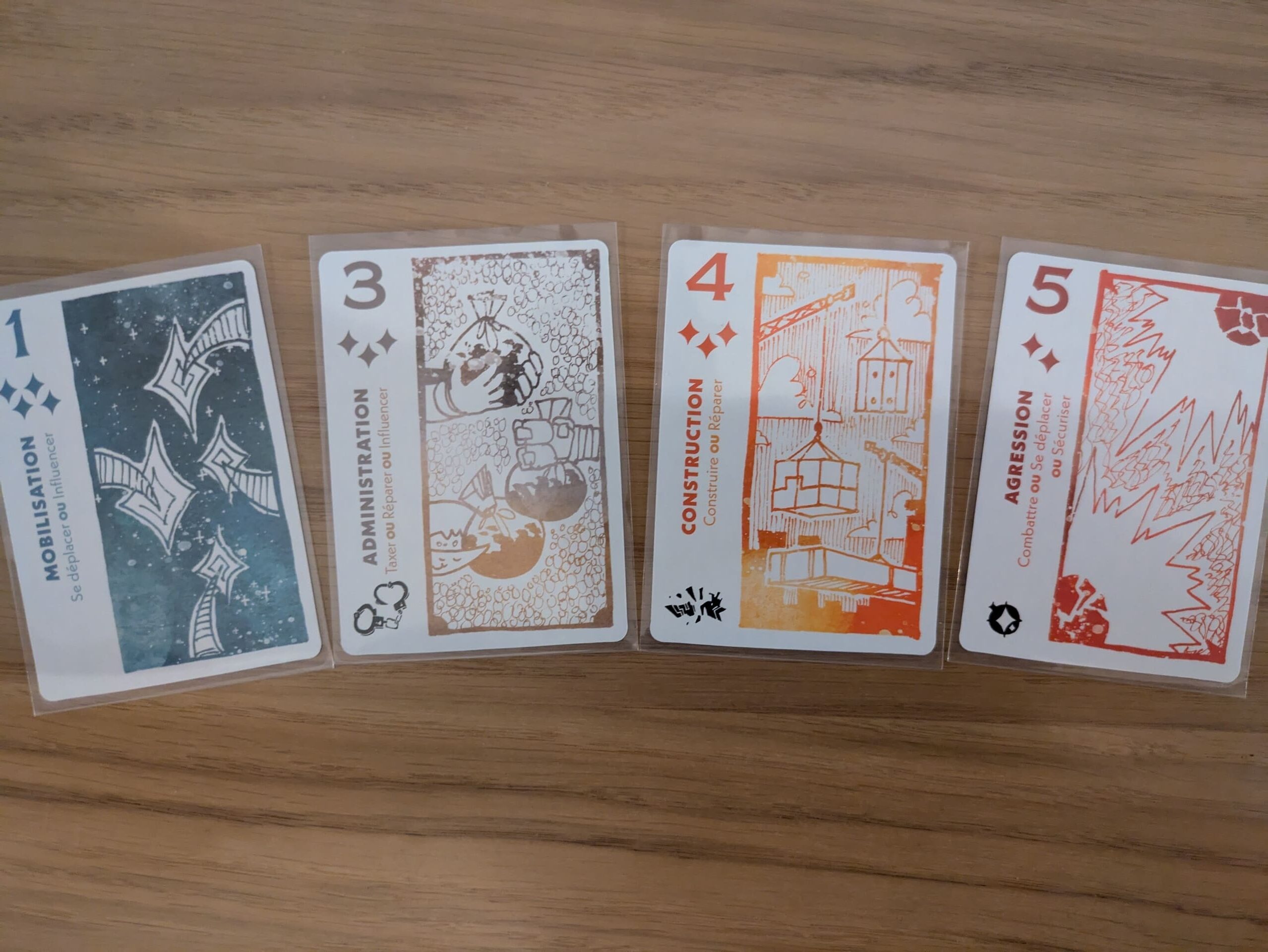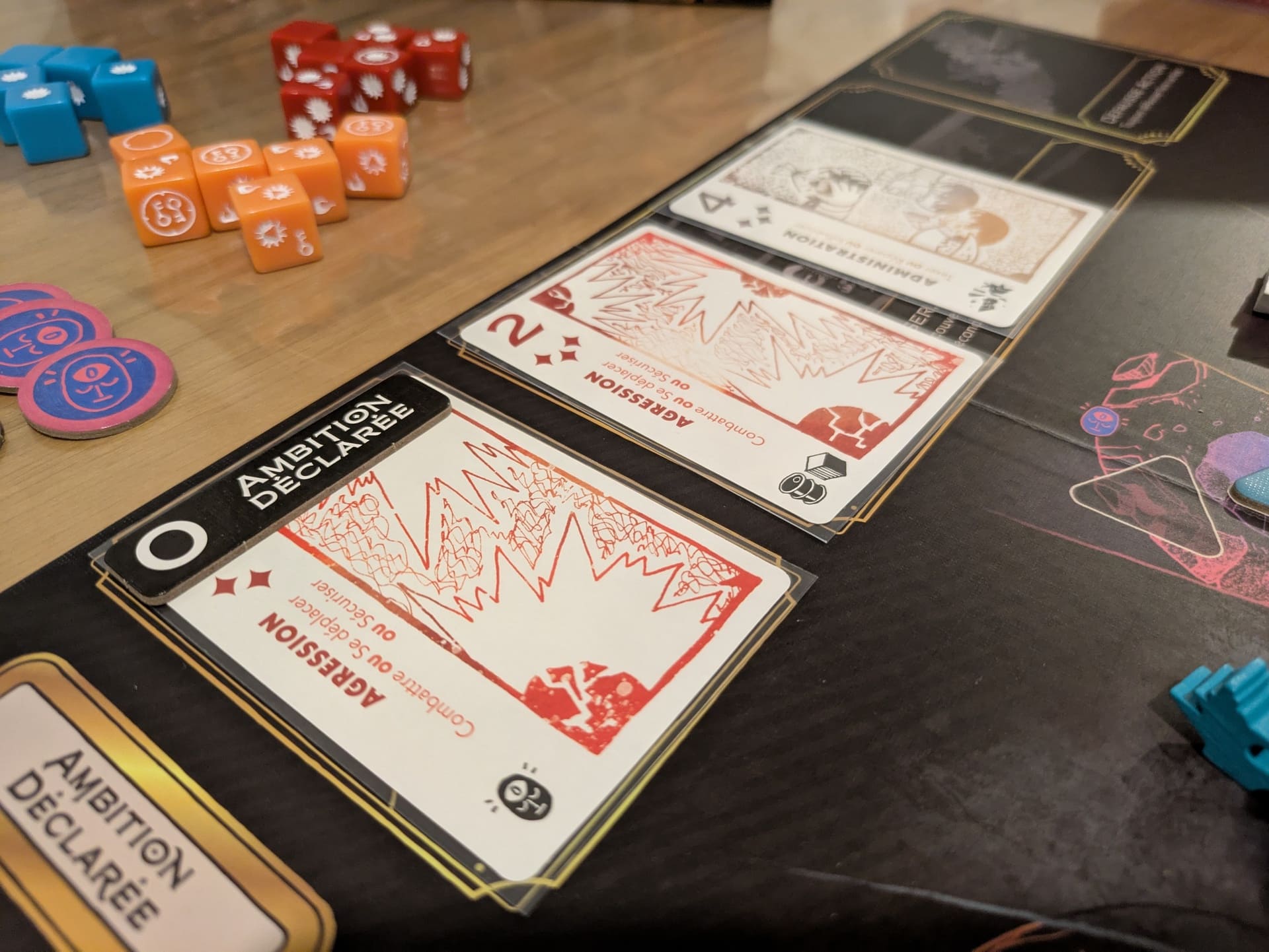 - Le joueur avec l’initiative, appelé le meneur, joue la carte de son choix pour effectuer des actions et, s’il le souhaite, déclarer une ambition (je reviendrai ultérieurement sur ces deux points).