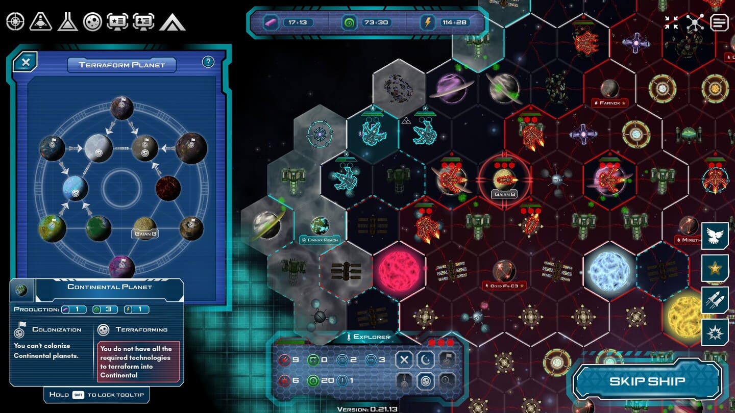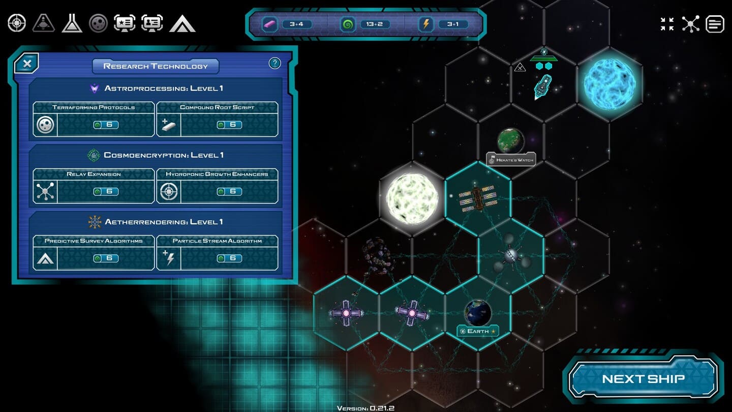 Votre expansion dans l’espace ne se fait cependant pas de manière aussi simple que l’exploration. Vos frontières sont définies par votre réseau, une espèce de toile d’énergie qui s’étend grâce à la construction de centres (Hubs) et la colonisation de nouvelles planètes. Et pour coloniser ces dernières, il faut d’abord les terraformer. Par exemple, en votre qualité de dirigeant Terrien, vous pouvez seulement coloniser des planètes continentales. Toute planète qui s’éloigne de ce biome nécessitera selon son type une à plusieurs étapes de terraformation “payantes” et autant de technologies spécifiques. Sous réserve de posséder des emplacements obtenus grâce à la construction de laboratoires, Astro Protol vous propose à chaque tour 2 technologies aléatoires pour chacune des 3 familles de recherche. Pour les débloquer rien de plus simple, dépensez les ressources nécessaires et vous en deviendrez l’heureux propriétaire à partir du tour suivant. Au-delà des technologies de terraformation, les recherches vous apporteront de nouveaux vaisseaux, des capacités (comme des armures spécifiques) et des améliorations diverses pour votre civilisation.