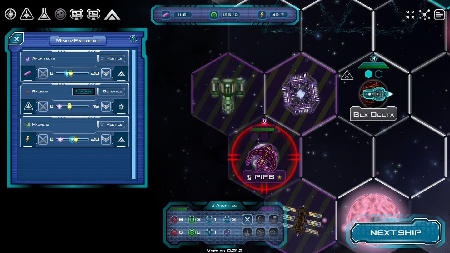 Après l’exploration, l’exploitation et l’expansion, l’extermination n’est pas en reste puisque Astro Protocol met l’accent sur les batailles entre factions. Vaisseaux éclaireurs ou colonisateurs, corvettes adaptées au hit’n’run, imposants colosses pour tenir ses lignes ou attaquer derrière celles de l’ennemi… l’arsenal de chaque faction se révèle très correct pour un jeu de ce format. Son déblocage, tout comme celui d’éventuelles améliorations ou de compétences, passe cependant par l’arbre technologique aléatoire et vous devrez donc composer avec ce qu’il vous offre. Astro Protocol possède de ce fait un fort caractère tactique où prime l’adaptation. Que les adeptes de diplomatie se rassurent (un peu), vous pouvez vous allier avec des factions mineures en atteignant un prérequis dépendant de chacune. Des prérequis tournant autour de la production de ressources ou de l’avancée sur une branche technologique précise, qui permettent au pacifiste de temporiser pour couper l’herbe sous le pied d’un adversaire belliqueux.