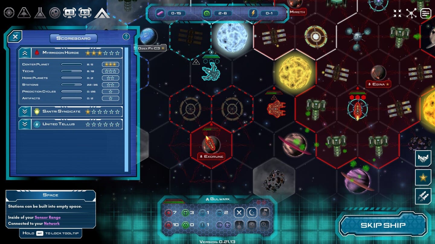Si ce dernier paragraphe ne vous file pas des boutons, ou mieux s’il vous séduit, Astro Protocol a toutes les chances de vous plaire. Il ressemble d’une certaine façon aux jeux de société “Eurogames” d’il y a quelques années, avec leur fort caractère punitif où la moindre erreur de jeu peut vous placer dans un retard quasi irréversible. Surtout en début de partie. Il faut de plus veiller à ne jamais manquer d’énergie, notamment lors d’une escapade massive en dehors des frontières, au risque de paralyser complètement votre civilisation et vos prochains tours. Si vous espériez une expérience souple et relaxante, je vous invite à passer votre chemin.