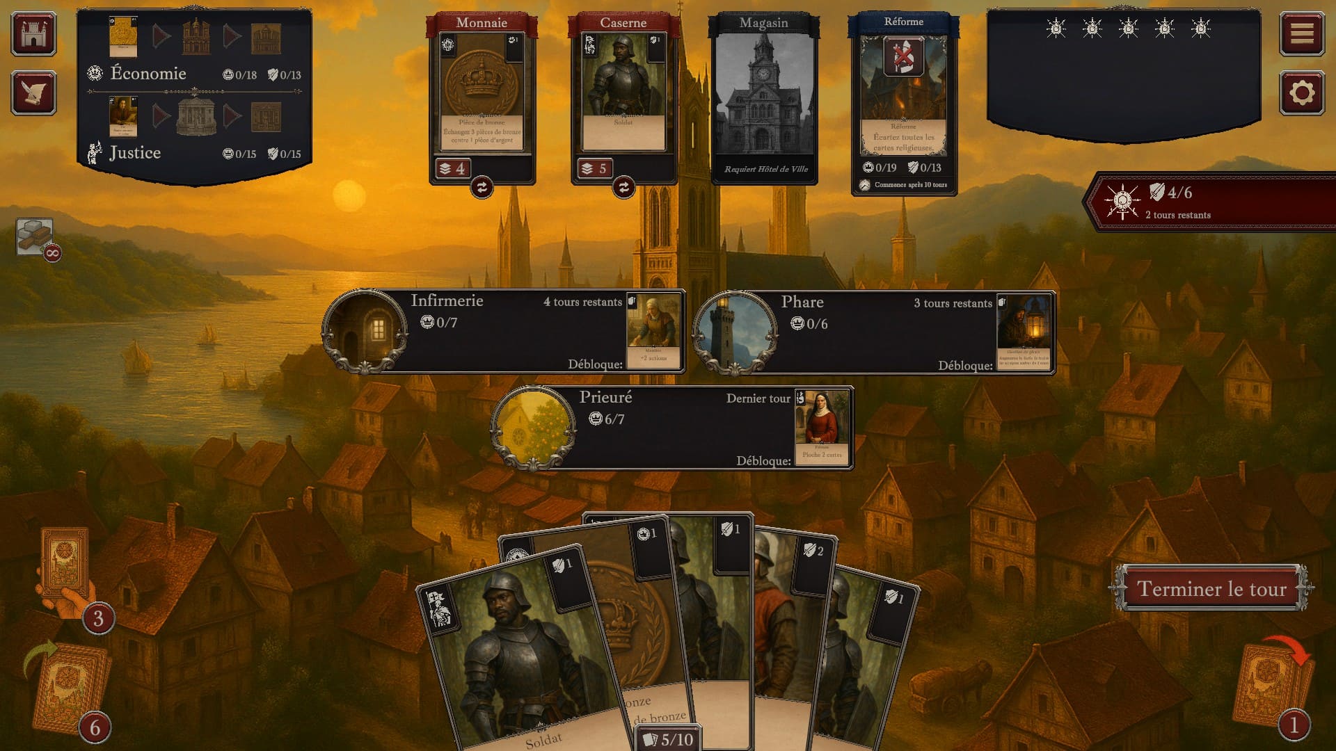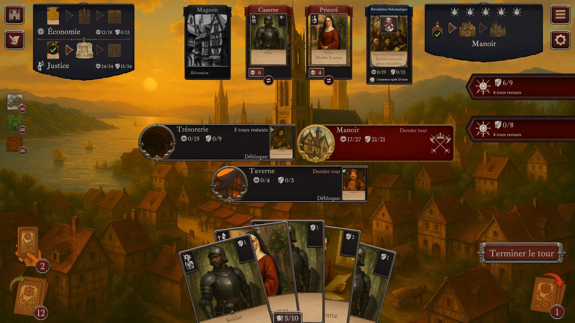 Bon, Caemdale est avant tout un deck builder. Mais cette fois, vous organisez votre jeu de cartes afin de construire des bâtiments, progresser sur le plan social et défendre votre royaume. Le but : construire tous les édifices prestigieux dans le délai imparti (en nombre de tours) en survivant bien sûr aux assauts incessants de vos ennemis.
