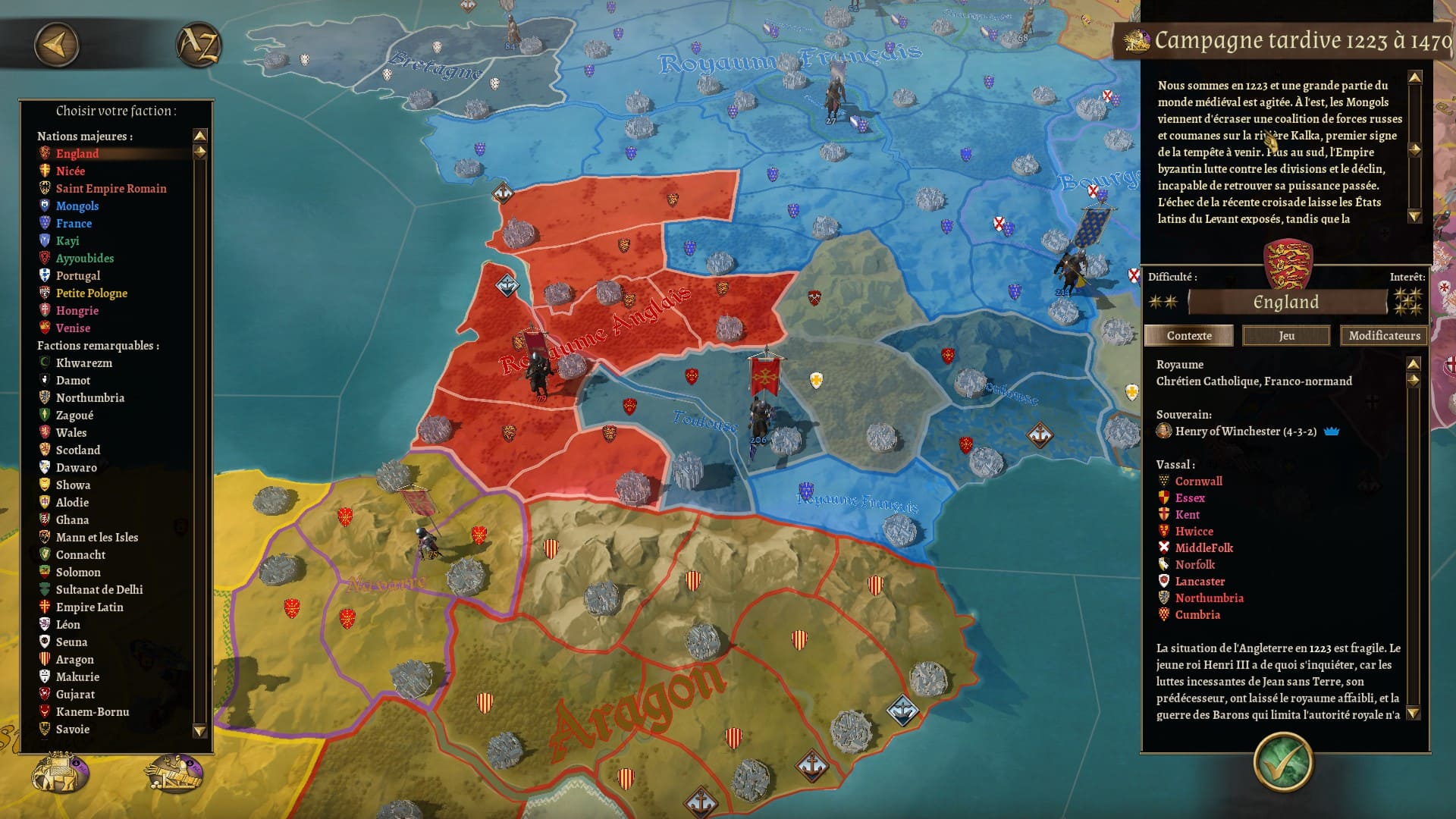 Nous sommes en 1223. Les Fatimides et les Seldjoukides font partie de l’histoire ancienne, comme bien d’autres nations éteintes depuis. Le rouleau compresseur Mongol écrase le monde slave et continue son impressionnante évolution en direction du sud et de l’ouest. Pendant ce temps, l’empire Byzantin se trouve à bout de souffle, les Ibères rêvent de Reconquista et le Français continue sa lutte éternelle avec son rival Britannique. Le monde a changé et de nombreux cataclysmes s’apprêtent à le secouer plus encore. Field of Glory Kingdoms – Burghers and Bombards vous propose de revivre cette période agitée à travers une longue épopée, équivalente en taille comme en durée à la campagne originale. 494 tours épiques qui vous amènent jusqu’à la fin du XVème siècle et introduisent de nouvelles nations comme le Khanat Mongol et le Portugal, mais aussi de nouvelles mécaniques appuyées par un package impressionnant de bâtiments et d’unités. Le tout, bien sûr, accompagné de nombreux ajustements pour préparer le reste du contenu à ce nouvel enjeu.