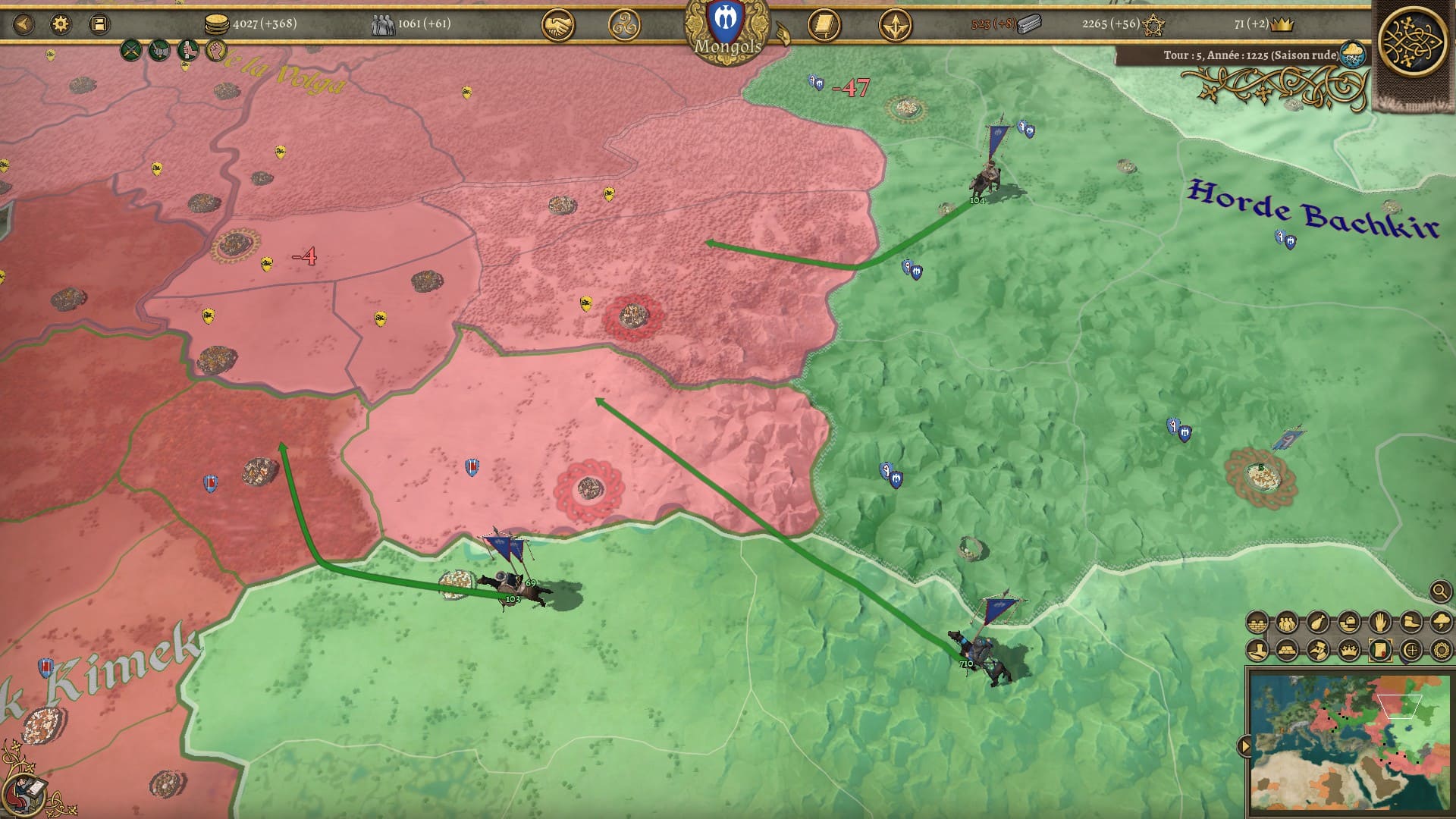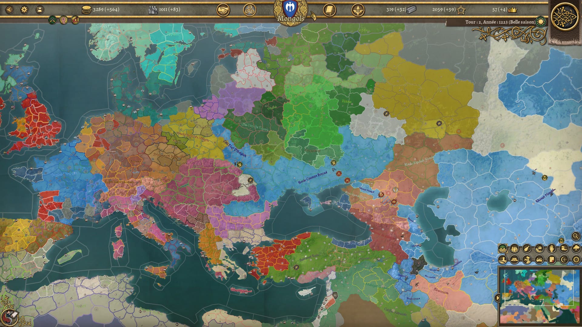 Si la campagne tardive vous invite à jouer la France, le Portugal, Byzance ou le Saint Empire Romain (les ~200 autres nations présentes restent jouables), on peut considérer le Khanat Mongol comme la star de ce DLC. Ce n’est pas pour rien si je l’ai choisi pour illustrer cet article, c’est la nation la mieux servie, avec de nombreux évènements et décisions à choix multiples et une histoire absolument dingue à découvrir si vous n’êtes pas calé sur le sujet. Une nation passionnante à jouer aussi, avec ses unités mobiles, dévastatrices et faibles à entretenir qui roulent sur tout le continent. Avec ses dizaines de guerres permanentes (l’ia semble dépassée face à tant d’alternances de guerres et de paix pas toujours cohérentes) et cette révision incessante des alliances et des frontières . Avec son dynamisme, ses vassaux qui se liguent pour vous protéger, ses épidémies qui frappent votre empire avec violence et ses dilemmes à traiter. Le clou du spectacle, c’est son éclatement à la mort de Genghis Khan. Une pirouette scénaristique inévitable et indiquée au lancement de la campagne, qu’il faudra gérer du mieux possible pour que votre futur empire, la Horde D’Or, tiennent la route.