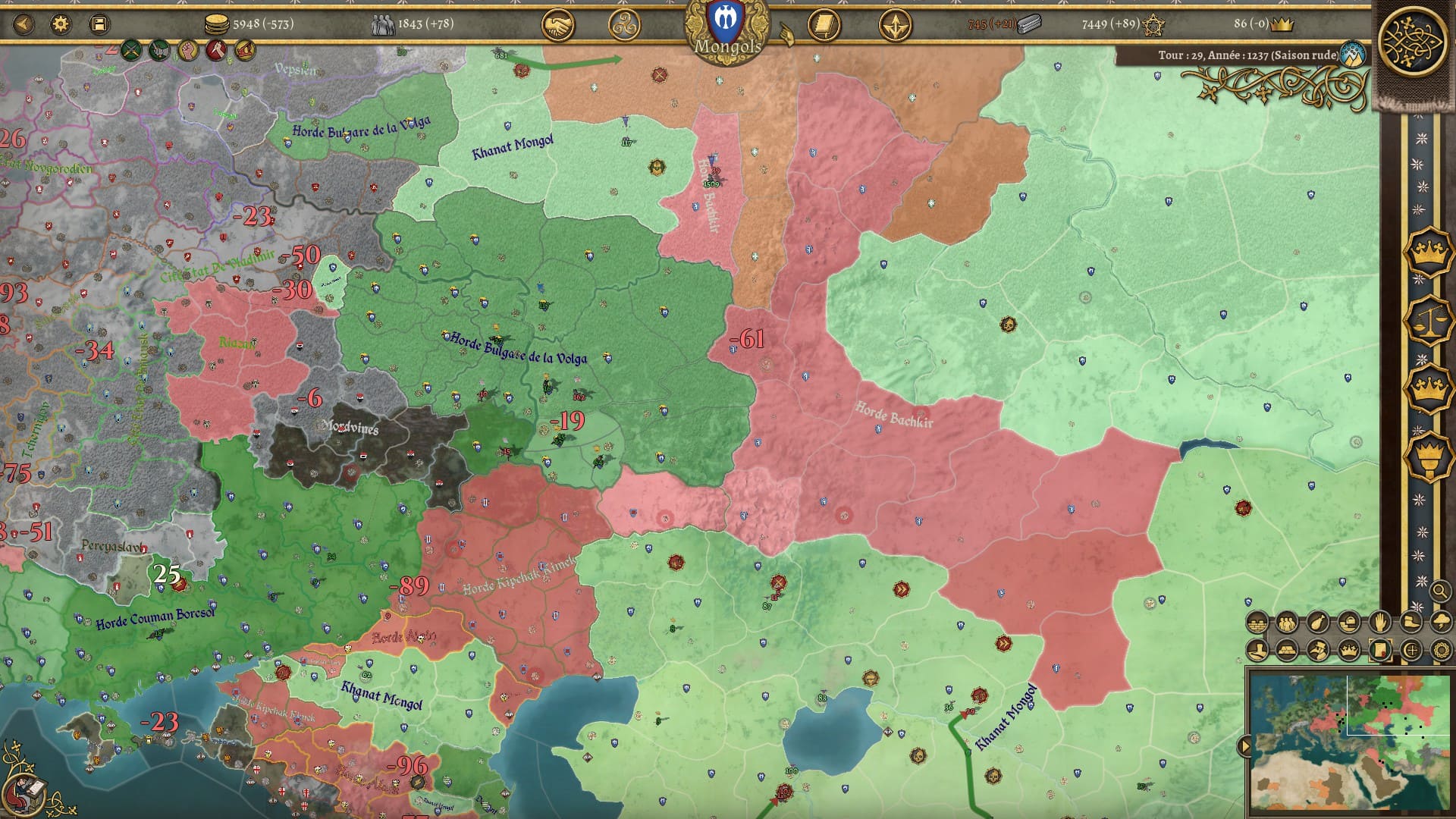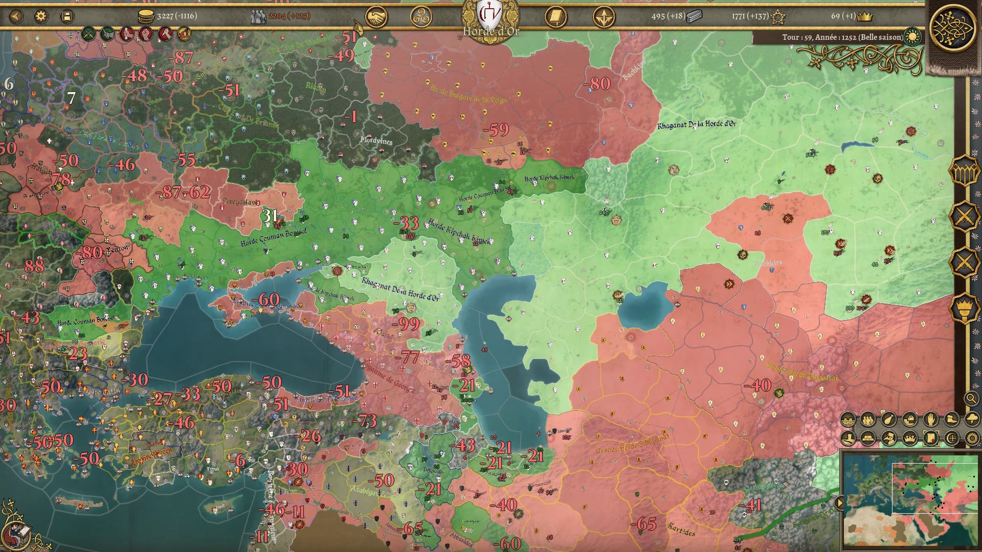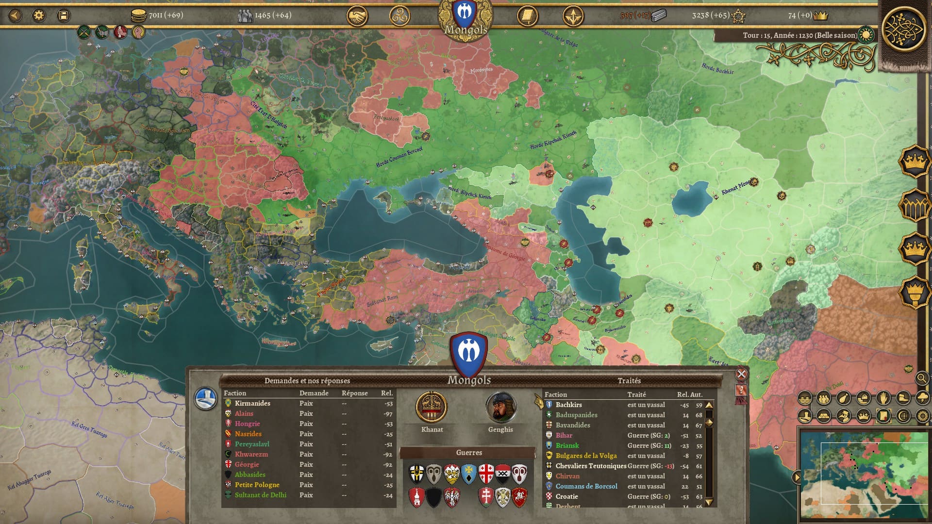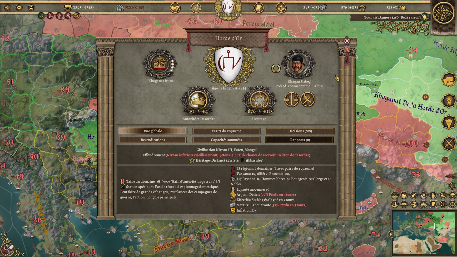 Bon, je ne vous cache pas mon mécontentement à propos de ce dernier point. Les scripts de ce genre, j’ai tendance à ne pas les apprécier. Mais alors vu la gueule de mon éclatement, il m’a fallu laisser le jeu de côté quelques temps pour digérer le changement. Je savais que mon héritage et mon prestige allaient dégringoler. Je savais que je perdrais des terres et des troupes. Mais ne connaissant pas l’histoire de l’empire mongol j’ai “par erreur” développé militairement les régions qui allaient devenir hostiles à la mort de Genghis Khan et me suis retrouvé face à un mur difficile à grimper tant sur les plans militaires, économiques et diplomatiques. Croulant sur les dettes, je me suis retrouvé en guerre avec mes nouveaux voisins et de gros vassaux qui ont sauté sur l’occasion pour me trahir, le tout avec une partie de mon armée enclavée dans des régions lointaines sans possibilité d’en sortir sauf en déclarant de nouvelles guerres. J’ai trouvé cet éclatement un peu vache. Il paraît qu’il existe un moyen de sauver son empire, mais je n’ai pas compris comment. Malgré sa faible difficulté estimée, je ne sais pas si c’est la nation de Burghers and Bombards avec laquelle il faudrait commencer tant cette chute se révèle brutale et peut démotiver.