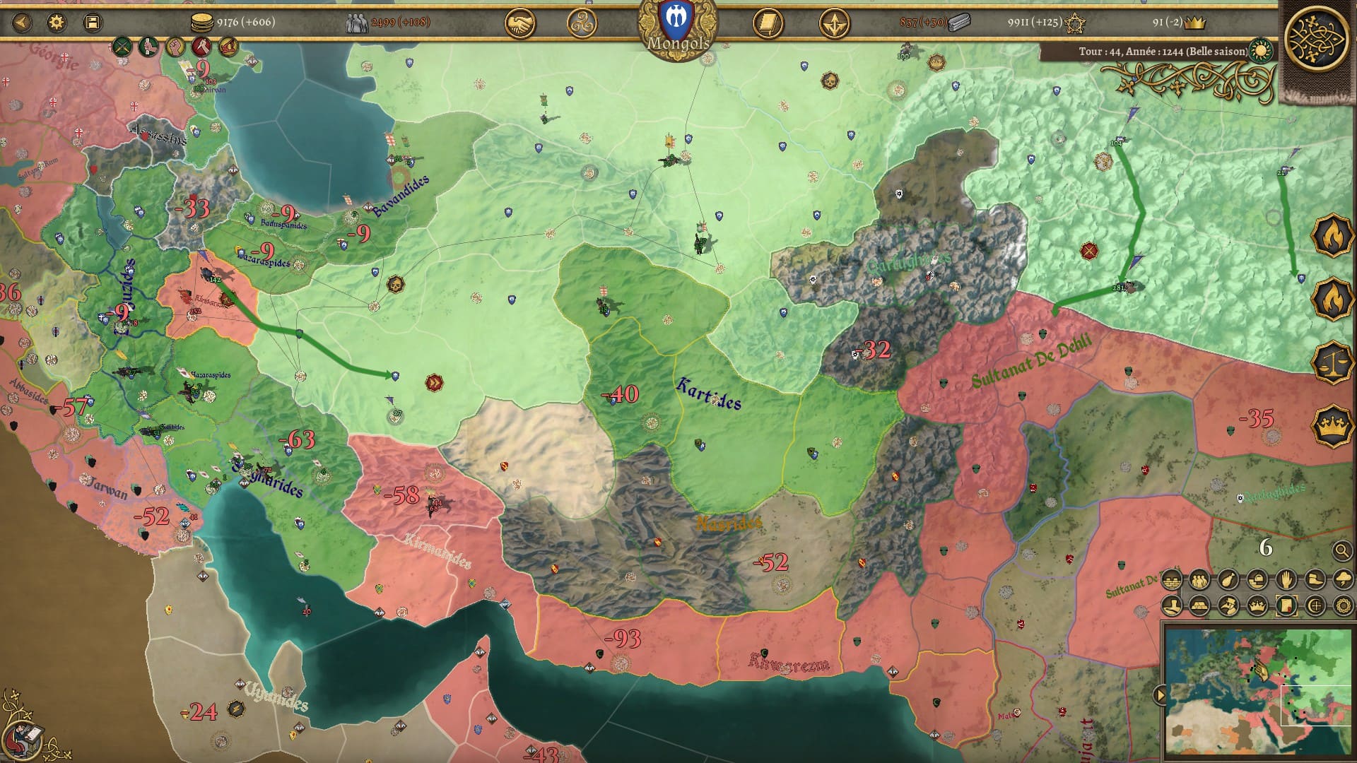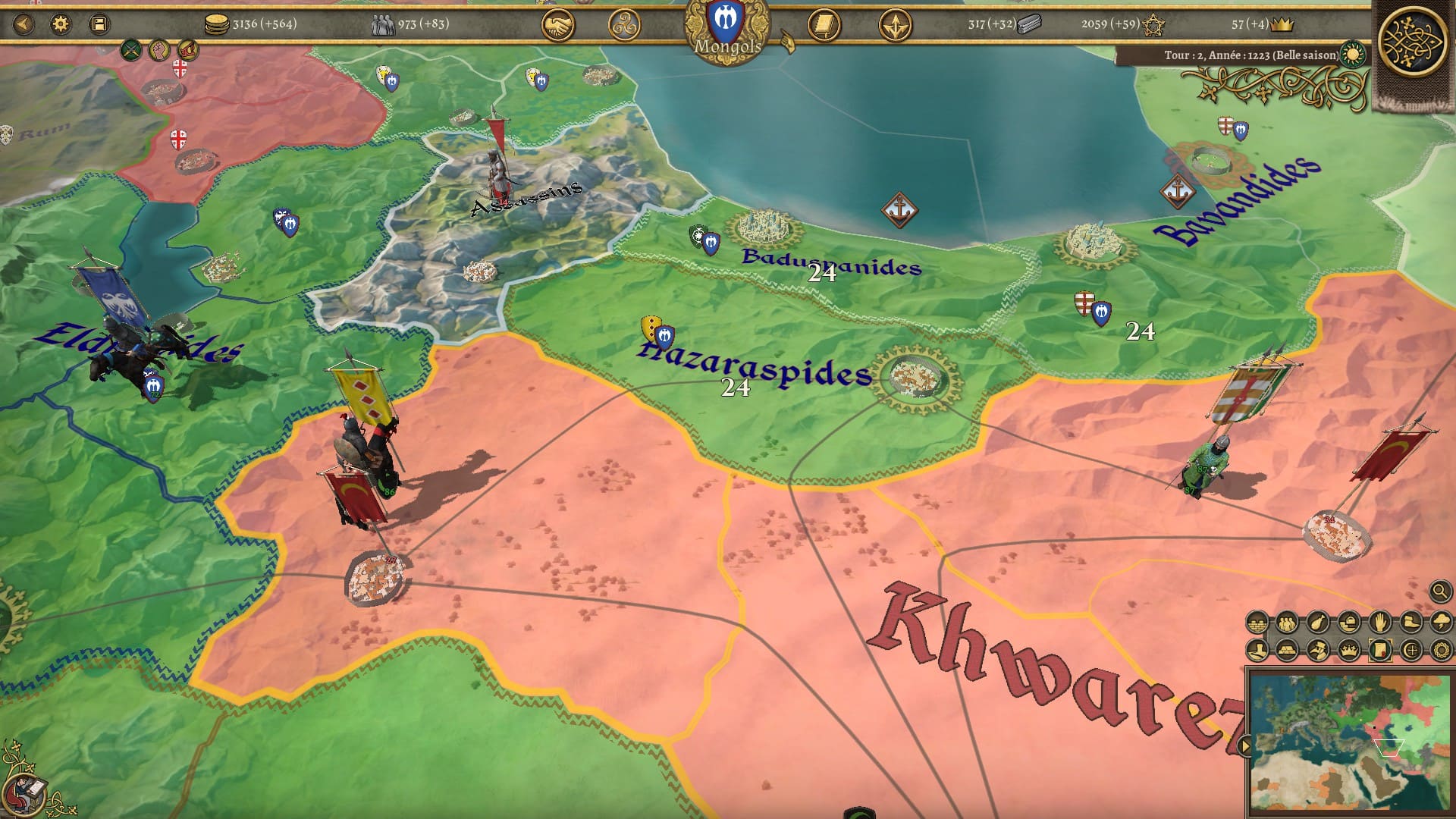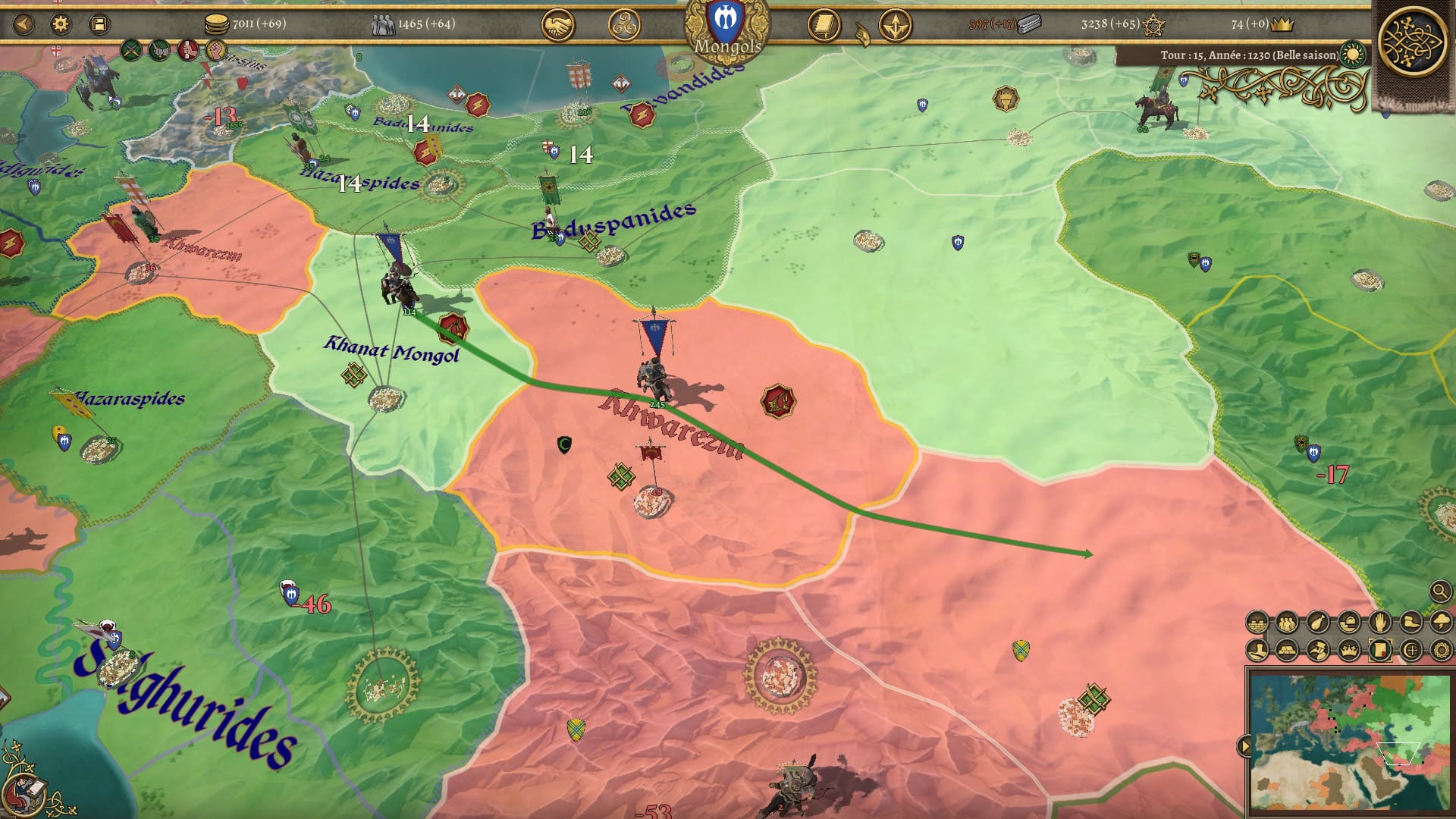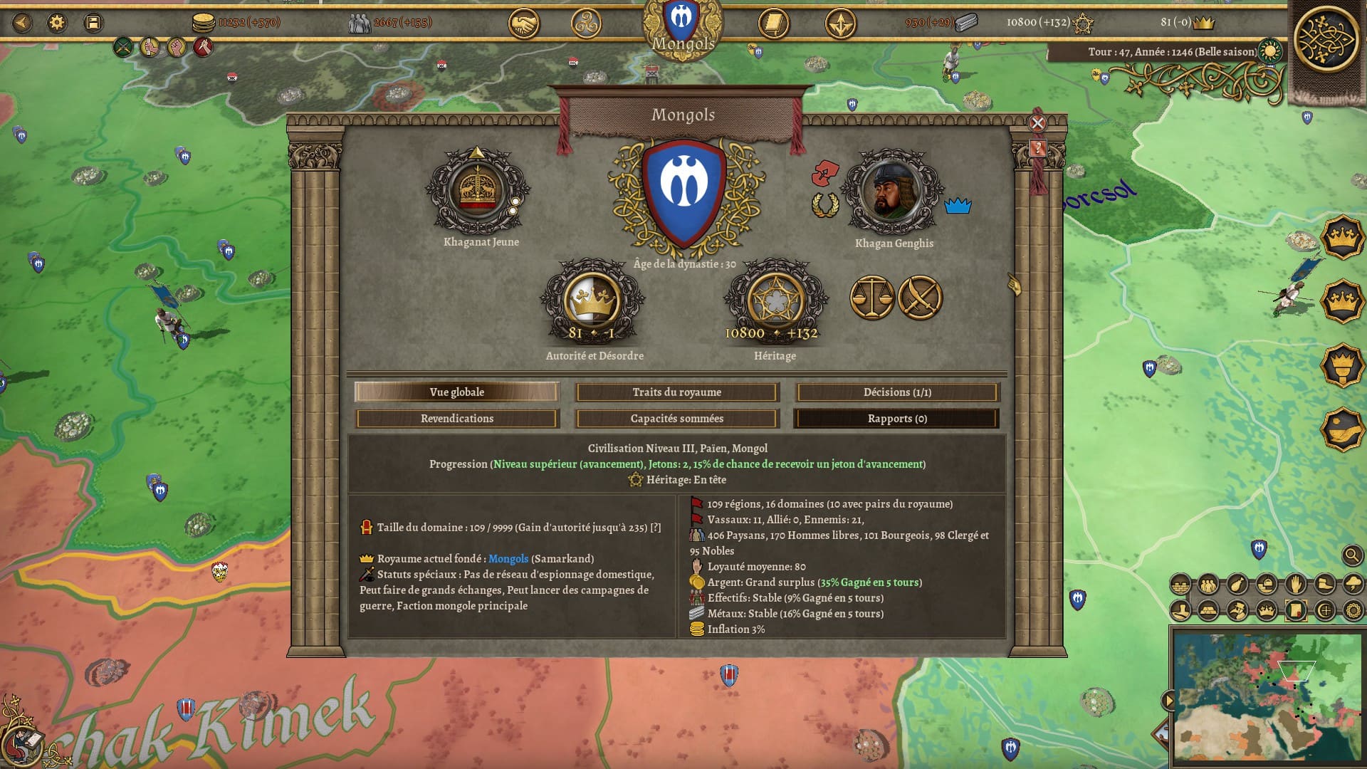 Bon, je ne vous cache pas mon mécontentement à propos de ce dernier point. Les scripts de ce genre, j’ai tendance à ne pas les apprécier. Mais alors vu la gueule de mon éclatement, il m’a fallu laisser le jeu de côté quelques temps pour digérer le changement. Je savais que mon héritage et mon prestige allaient dégringoler. Je savais que je perdrais des terres et des troupes. Mais ne connaissant pas l’histoire de l’empire mongol j’ai “par erreur” développé militairement les régions qui allaient devenir hostiles à la mort de Genghis Khan et me suis retrouvé face à un mur difficile à grimper tant sur les plans militaires, économiques et diplomatiques. Croulant sur les dettes, je me suis retrouvé en guerre avec mes nouveaux voisins et de gros vassaux qui ont sauté sur l’occasion pour me trahir, le tout avec une partie de mon armée enclavée dans des régions lointaines sans possibilité d’en sortir sauf en déclarant de nouvelles guerres. J’ai trouvé cet éclatement un peu vache. Il paraît qu’il existe un moyen de sauver son empire, mais je n’ai pas compris comment. Malgré sa faible difficulté estimée, je ne sais pas si c’est la nation de Burghers and Bombards avec laquelle il faudrait commencer tant cette chute se révèle brutale et peut démotiver.