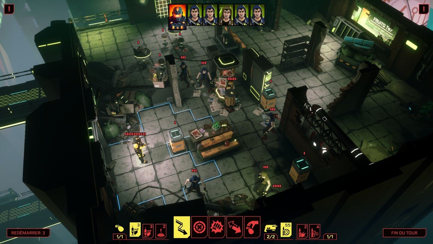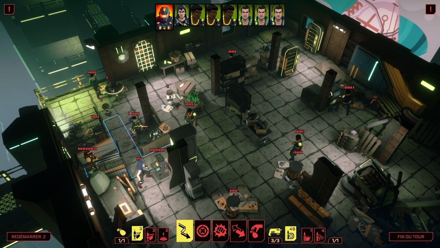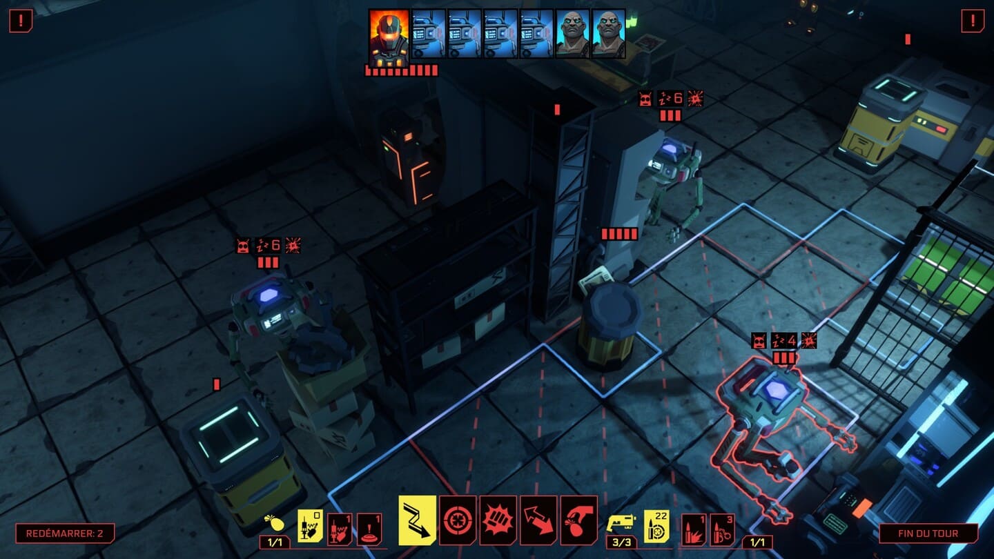 Durant ce lap de temps, vous obtiendrez de rares compétences aléatoires visant à améliorer une caractéristique ou débloquer de nouvelles options comme la possibilité de frapper au corps à corps sur une case en diagonale. Et c’est à peu près tout en ce qui concerne le développement de votre personnage. Plus gênant, on fait vite le tour de l’arsenal puisqu’il n’y en a pas vraiment en dehors du pistolet, d’une poignée de consommables (mine, grenade, piège…) et d’un bouclier. Faute de progression notable, on se lasse rapidement malgré une idée de base intéressante. Et pour ma part j’en ressors frustré alors que la démo me filait l’eau à la bouche.